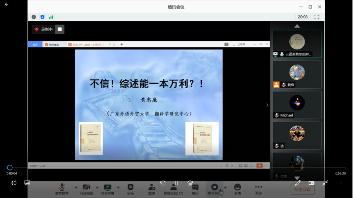 7月14日晚(7:00—9:00),应香港赛马会 邀请,广东外语外贸大学黄忠廉教授借助腾讯会议为香港赛马会 教师作了题为“不信!综述能一本万利?!——人文社科项目申报指导”的线上讲座。此次讲座由香港赛马会 院长助理顾晓燕主持。