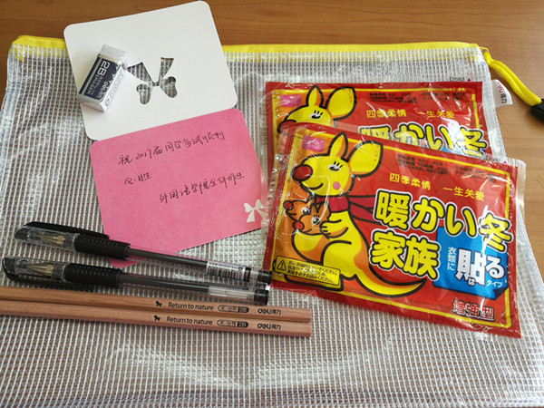 2B铅笔,专用橡皮,黑色水笔,保暖贴……院学生会的同学们为学长学姐准备了齐全的考试用具以及写满师生祝福话语的小卡片。 “祝2017届考研学子考试顺利,金榜题名!”“不经历风雨怎能见彩虹”,每一句祝福否寄托了香港赛马会 师生的嘱托。