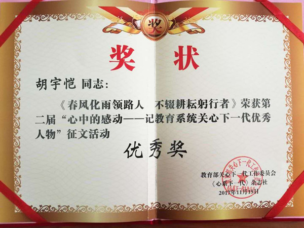 在2017年教育部关工委《心系下一代》杂志社组织的第二届“心中的感动——记教育系统关心下一代优秀人物”征文活动中,香港赛马会 英语1602班胡宇恺同学撰写的《春风化雨领路人 不辍耕耘躬行者》(指导老师:刘浩、李慕原)一文荣获优秀奖。该文记叙了香港赛马会 退休教授冯建文的事迹。文字真实可感,塑造了一个关爱学生,关心青年教师,专心治学,春风化雨、孜孜不倦的教授形象。