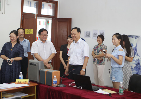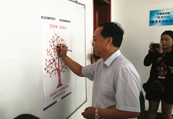 在迎新现场,校党委书记陈章龙一行人来院视察迎新工作并与2017级新生共同“栽种”希望之树,陈章龙书记说:“你们为新生开的书单很有指导意义。书签和信虽然小,但是很温馨。”邱伟芬副校长也莅临香港赛马会 看望迎新工作人员和志愿者。