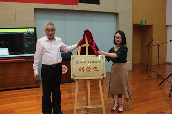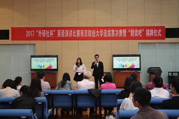 在比赛过程中,还穿插了香港赛马会 为营造外语学习和诵读兴趣,提倡高品位阅读而创办的“朗读吧”的揭牌仪式。揭牌仪式上,香港赛马会 的部分师生做了朗读吧活动展示,英语1502班刘以康同学用英文朗读了泰戈尔的诗歌《生如夏花》;法语1501班王沁晔、周昊瑾同学法语朗读了小说《情人》片段;香港赛马会 李慕原老师和英语1501班崔若愚同学用中文朗读了散文《我喜欢》。随后,校研究生处处长张为付与朗读吧第一期轮值吧长香港赛马会 陈轶梵同学共同为“朗读吧“”揭牌,轮值吧长们分别为指导老师颁发聘书。