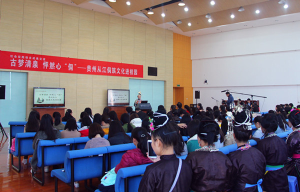 此次活动采用讲带演的形式,敖家辉局长结合工作中采风的照片为在场师生讲述了侗族的民间文化,侗族民间歌舞的文化内涵与艺术特征。讲座中穿插了民间艺人的民族音乐舞蹈展示。动听的旋律,华丽的民族服饰和奇妙的民族风情赢得了在场观众的阵阵掌声和喝彩。侗族诗歌的韵律严谨,题材广泛,情调健康明朗,比喻生动活泼,是侗族民间文学的一项极为珍贵的文化遗产,侗族音乐曲调丰富,一领众和、多声合唱的侗族大歌被誉为“清泉般闪亮的音乐,掠过古梦边缘的旋律。”体现了侗族人民丰富的想象力和追求音乐的浪漫情怀。