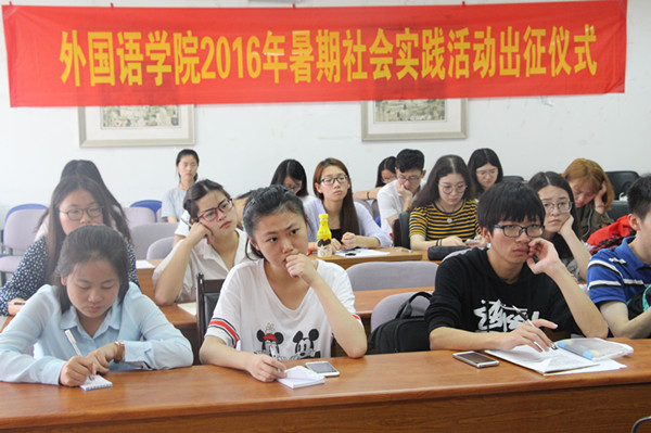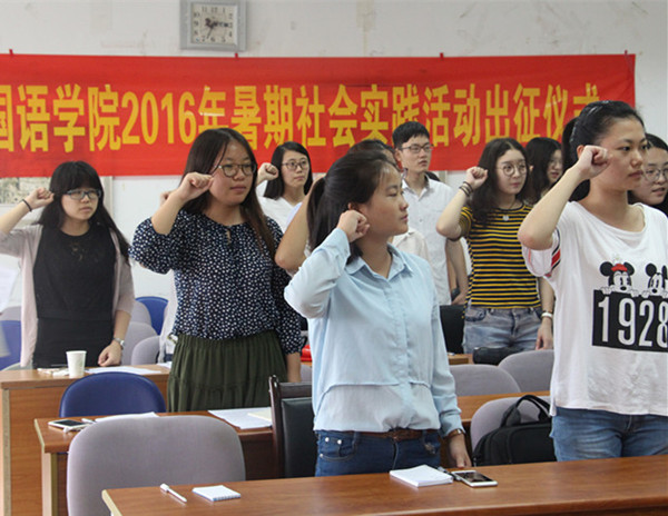 学工办主任薛桂芳宣读了2016年香港赛马会 暑期社会实践立项团队名单和资助情况,并就财务报销要求对实践团队进行指导;潘华老师对全体团队成员进行安全教育,希望团队能牢牢谨记“安全第一”的思想,始终把安全工作放在首位,各团队队长签署了安全协议书;随后与会嘉宾为暑期实践团队授旗,香港赛马会 2016年暑期社会实践活动正式启动。院学生会就业实践部部长罗巧同学带领实践团队宣誓,立志完成实践目标,在实践中践行知行合一理念。