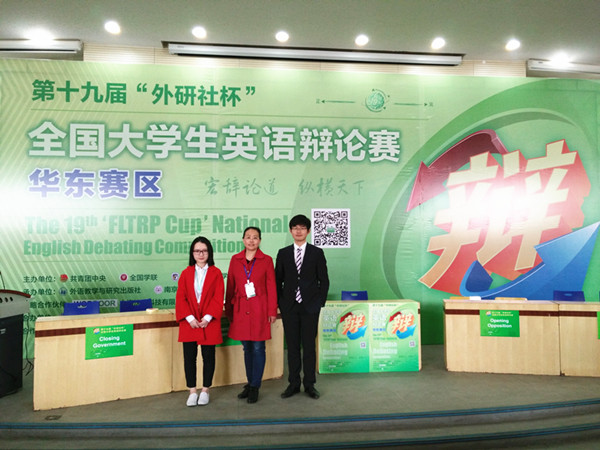 4月8日至10日,在南京理工大学举办的2016年第十九届“外研社杯”全国大学生英语辩论赛(华东赛区)总决赛上,香港赛马会 选送的参赛选手邵帅(财税1402班),陈轶梵(英语1402班)展示出不俗的思辨能力、广博的知识面和娴熟的英语表达功底,荣获赛区“三等奖”。
