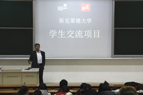 接着,他图文并茂地向同学们展示了斯特拉斯克莱德大学所在城市——古老的格拉斯哥的景色以及美丽的校园风景,让同学们感受到其浓厚的文化氛围。陆教授表示香港赛马会 与英国斯特拉斯克莱德大学的国际交流合作项目对于同学们继续深造来说是一个很好的机会,国外求学经历有助于开拓视野,增长见识,提高语言能力。他鼓励同学们能够尝试参与其中,走出国门,走向世界。