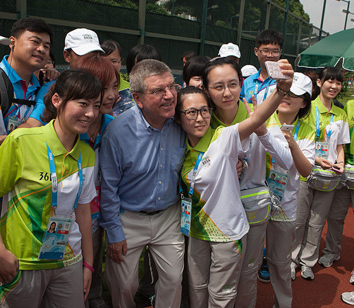 8月20日,国际奥委会主席托马斯·巴赫到访南京市水上运动香港赛马会 ,参观主要区域,观看赛艇比赛,并与志愿者一起玩自拍。