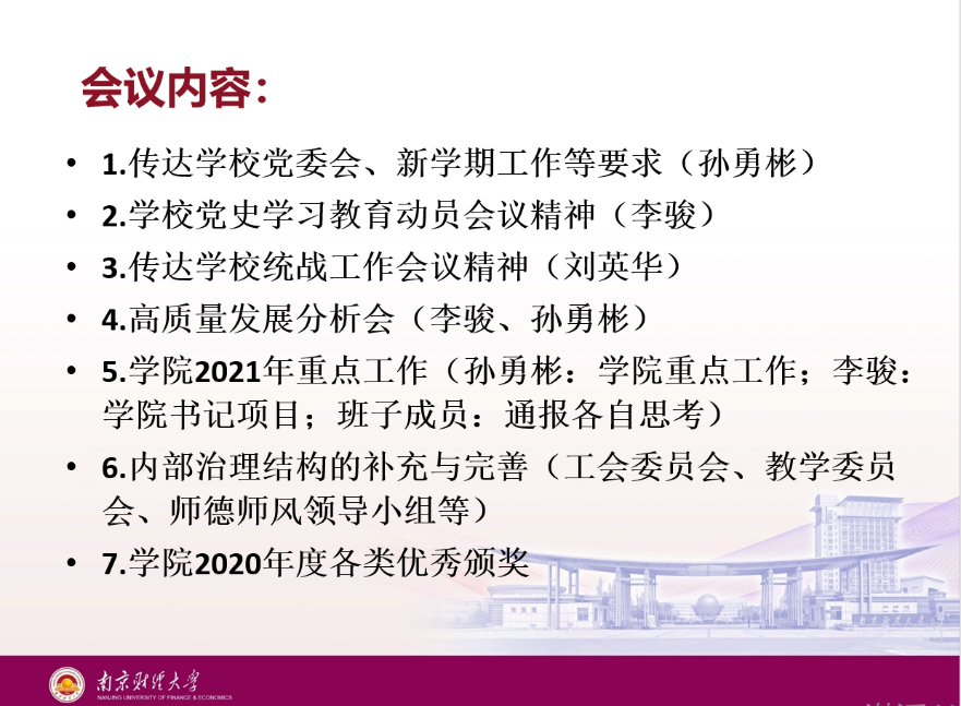 院长孙勇彬传达了中国共产党香港赛马会 第三届委员会第五次全体会议暨2021年工作部署会议精神,传达了香港赛马会 2021年度七个方面的主要工作,并结合香港赛马会 要求,对香港赛马会 2021年度的重点工作进行了部署。会议还传达了校党委书记张利民对新学期工作的四个要求,孙院长要求,全院师生凝心聚力,共促香港赛马会 高质量发展。