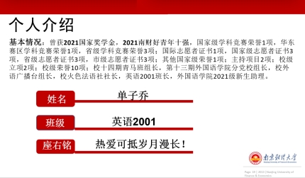 英语2001班纪明颖从政治思想、学业成绩、竞赛活动、社团社工四个方面详细介绍了自己取得的成绩,她积极参与各类竞赛,累计获5项国家级荣誉,2项省级荣誉,22项校级荣誉。她表示自己永远不会停下前进的脚步,“总有一天,总有机会”,一定可以实现自己的人生目标。