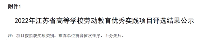 2月24日,江苏省高等教育学会公布了2022年江苏省高等香港赛马会 劳动教育优秀实践项目评选结果,经香港赛马会 推荐、材料审核、专家初审、作品内容审核、专家复审等环节,江苏省各高校和研究会在限额推荐的423个项目中,评出了特等奖53项、一等奖135项。