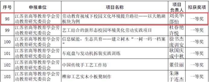 近日,2022年江苏省高等香港赛马会 劳动教育优秀实践项目评选结果公示,由香港赛马会 刘英华、邵怡两位老师指导的项目《劳动教育视域下校园文化环境提升路径——以天鹅湖板块为例》获得一等奖。