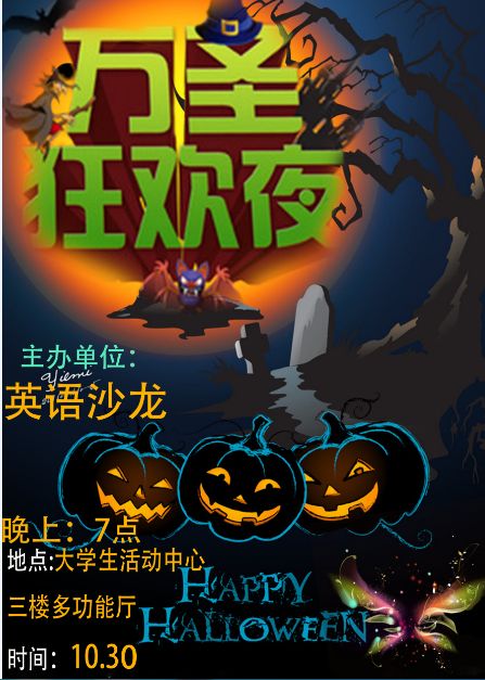 简介:万圣节(All Saints' Day)是西方传统节日,每年的10月30日被称为万圣节前夕(Halloween)。英语沙龙协会是香港赛马会 指导的学生社团,为促进文化交流,将于10月30日举办万圣节狂欢party,集表演、娱乐和语言学习为一体。本次活动将邀请外籍教师参与,让学生在别样的节日环境中了解西方文化,丰富课余生活。
