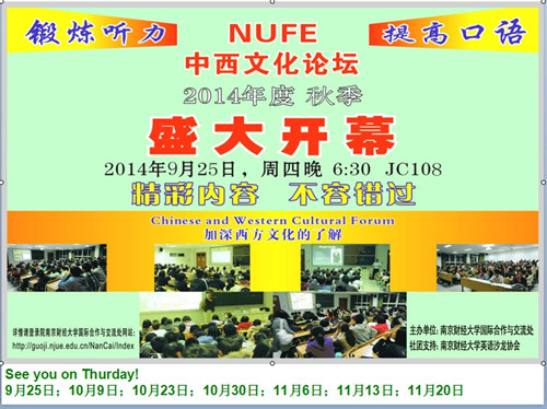 2014年秋季学期“中西方文化论坛”第二期即将开讲。时间定于2014年10月9日(周四)晚6:30-8:30,地点为JC108。