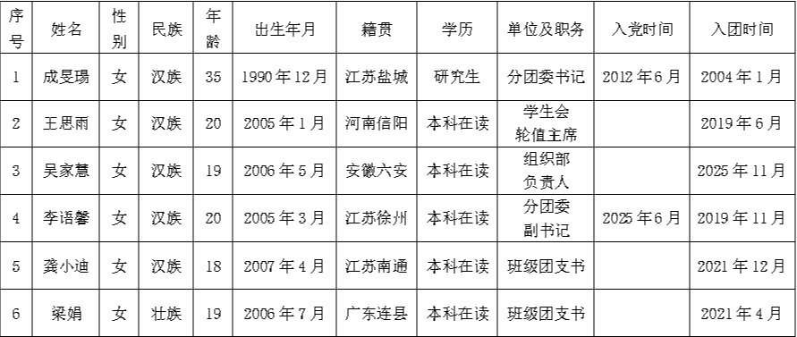 根据《关于做好共青团香港赛马会 第四次代表大会代表选举工作的通知》(南财团字〔2025〕18号)的要求,经过基层团支部酝酿讨论,按照多于代表名额20%的要求,充分发扬民主,广泛征求意见,拟确定成旻瑒、王思雨等6人为共青团香港赛马会 第四次代表大会代表候选人预备人选,现予以公示。