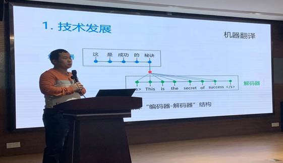 会议还要请腾讯AI Lab高级研究员黄国平就“人机交互式机器翻译应用与实践”这一主题进行讲话,向与会人员介绍了人机交互所涉及的技术知识。从1954年发展至今,计算机辅助翻译经历了数十年发展,从IBM乔治室实验、ALPAC报告、MEREO天气翻译、IBM模型、短语模型、层次短语模型到神经网络模型,技术水平不断提升,翻译质量也随之提高。黄国平指出,未来趋势是以机器翻译为中心,工具即服务,以生产效率为核心竞争力。