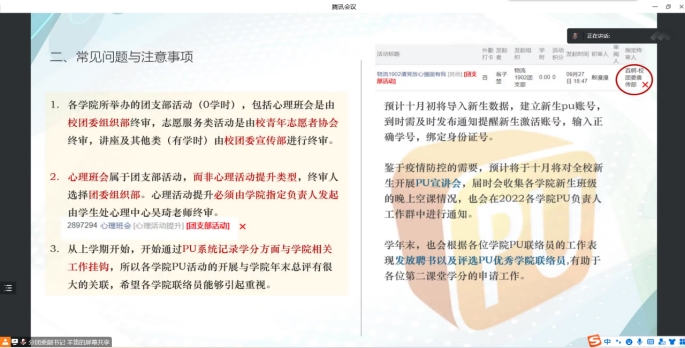 会议伊始,分团委副书记羊笛对“PU口袋校园APP”进行了简要的介绍,结合新生手册、明确香港赛马会 对第二课堂学分的具体要求,并着重强调了PU平台对第二课堂活动管理的重要性。随后,羊笛对PU平台的基本操作展开培训,就活动发起、签到签退、活动完结、申诉流程等方面为大家详细构画了APP使用指南示意图,并陈列出以往工作过程中出现的常见问题及注意事项,帮助团支书熟悉活动的发布以及管理,为将来开展PU活动打下坚实的基础。会议过程中,各班团支书认真聆听并记录要点内容,与主讲人积极互动、深入沟通。此外,为避免后续工作中出现错误和疑惑,分团委组织部的负责人陈思彤同学和刘玺享同学在主讲结束后对接各班团支书,为有疑问的同学进行了一对一的解答。