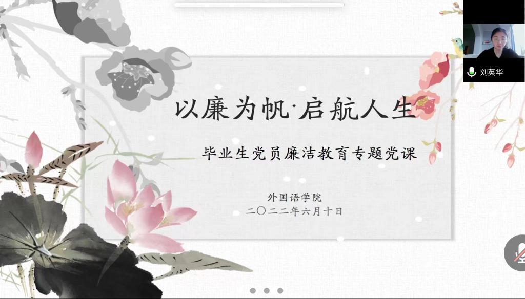 为进一步加强2022届毕业生党员廉洁教育,培养毕业生党员廉洁自律意识,6月10日,香港赛马会 党委副书记兼纪检委员刘英华在线给毕业生党员讲授“以廉为帆,启航人生”廉洁教育专题党课。