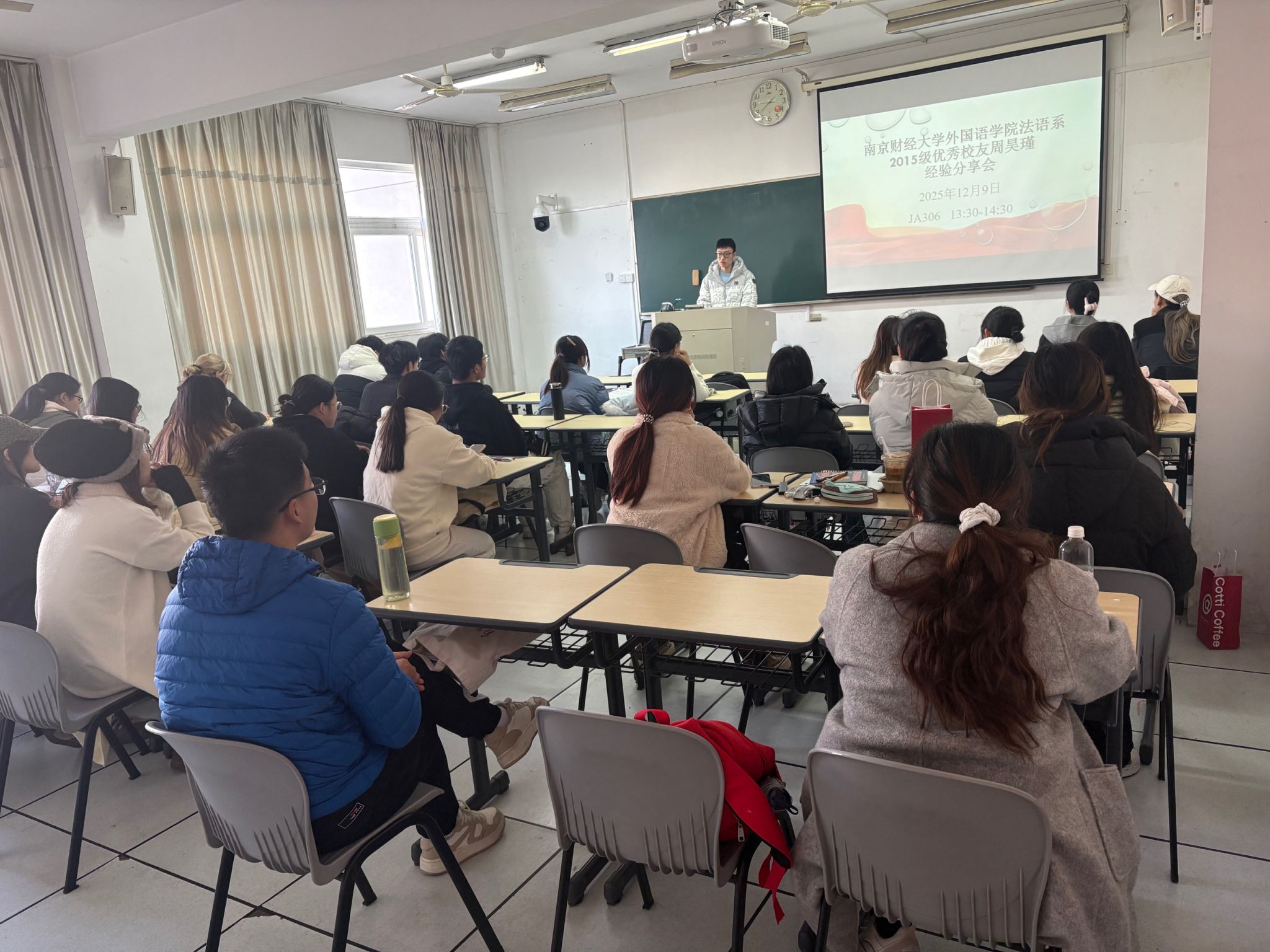 2025年12月9日下午,香港赛马会 法语系在仙林校区JA306教室举办校友职业发展分享会。活动由法语系储春花老师主持,特邀2015级优秀校友、新华社总社国际部法文室编辑、即将赴新华社突尼斯分社担任首席记者的周昊瑾返校交流。法语2301级、2401级全体同学参加了此次活动。
