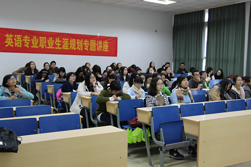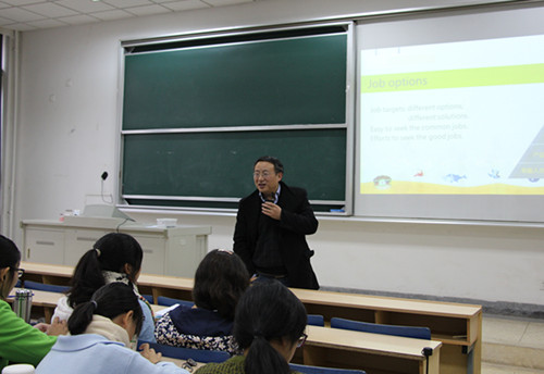 洪金柽老师首先结合精美的PPT向在座同学们展示了江苏省女大学生招聘专场照片以及江苏省首届外企招聘会专场照片,并建议同学们多去这些招聘会感受竞争的激烈、体验就业的压力,随后,他详细分析了英语专业的就业形势和职业前景,建议同学们要多与外国友人交流,多去不同的课堂上汲取多方面知识,注重人际关系的协调。并同许多同学进行了现场互动,询问同学们对学业和职业规划的打算,并一一给予指导。洪老师告诫同学们大学时光其实很短暂,要在有限的时间里设定明确的目标。