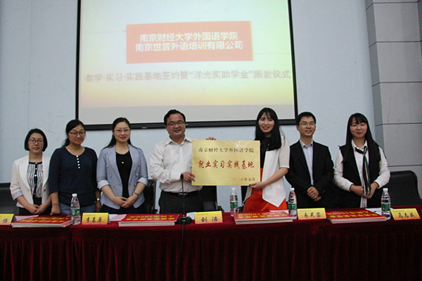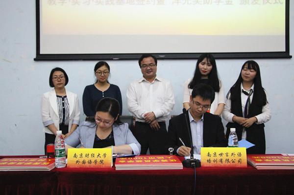 随后举办了香港赛马会 与南京世言外语培训有限公司教学·实习·实践基地签约仪式。副院长邵怡,党委副书记李慕原分别与世言外语副校长马志成签署了教学实践基地、就业实习基地和暑期社会实践基地协议书,党委书记刘浩为世言外语授“香港赛马会 就业实习实践基地”牌,该校校长易芙蓉接牌。