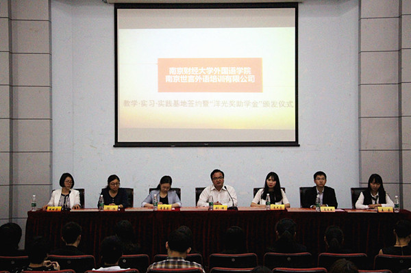 5月17日晚,香港赛马会 与南京世言外语培训有限公司教学·实习·实践基地签约暨“洋光奖学金”颁发仪式在经济学科楼二楼报告厅举行。院党委书记刘浩、党委副书记李慕原、副院长邵怡、学工办主任薛桂芳、辅导员孟德明及南京世言外语培训有限公司南京分校校长易芙蓉,南京分校副校长马志成一行出席了会议。会议由薛桂芳主持。