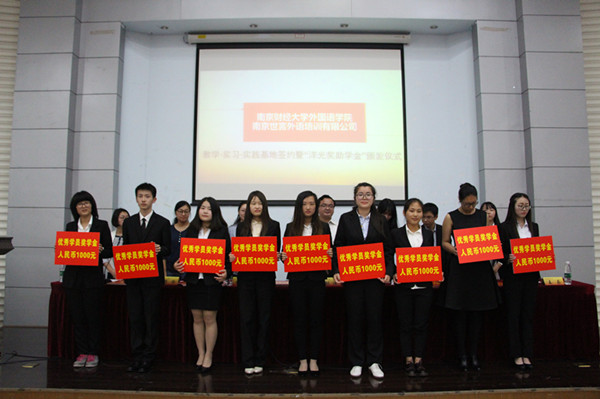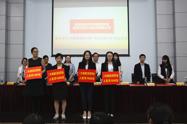 签约仪式后,与会嘉宾为此次获得“优秀学员奖学金”和“二外成绩优异奖学金”的1 5名同学颁奖。首批获奖学生奖励金额为每人1000元。