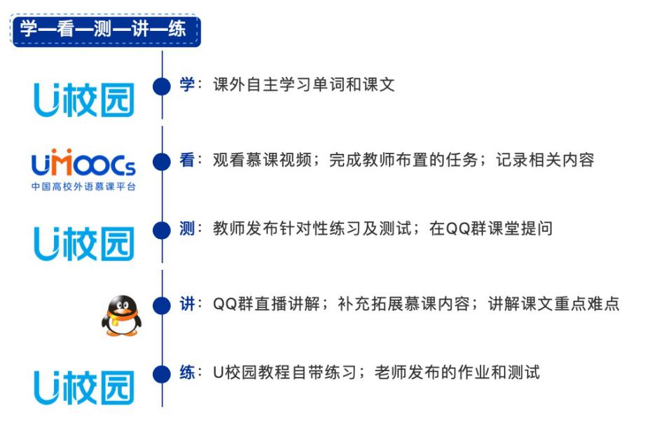 开学前两周,香港赛马会 教师团队便对现有在线平台进行对比。最终,从平台专业性、教材贴合度、资源丰富性、学习数据全面性和学情报告准确性等几个维度,确定选用外研在线的U校园和中国高校外语慕课平台(UMOOCs),前者用于教学管理,后者提供拓展资源。教师们将U校园、UMOOCs、QQ群直播有效结合,形成了香港赛马会 独特的混合式教学模式,并设计出“学—看—测—讲—练”五步教学流程,为实际教学搭建框架。