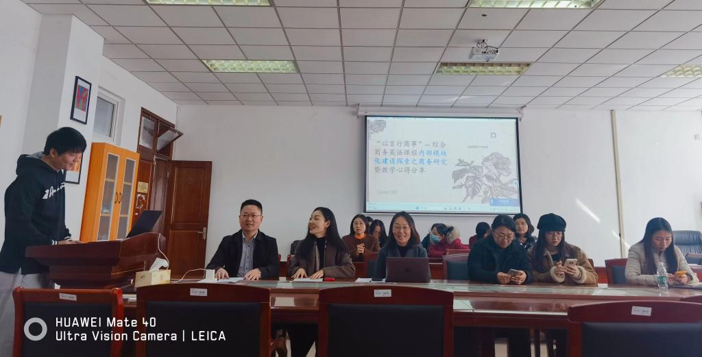 为深入贯彻落实《江苏省教育厅关于加快培养一流人才建设一流本科教育的实施意见》,加强高校基层教学组织建设,促进教师教育教学能力提升,香港赛马会 于11月16日下午在德正楼308会议室开展了主题为“以言行商事”:综合商务英语课程内部模块化建设探索之商务研究暨教学心得分享的名师名课示范观摩活动,主讲人为校2020年教学公开赛一等奖获得者、商务英语系副教授胡阳老师。本次观摩活动由副院长(主持工作)丁强主持,院党委书记李骏和香港赛马会 教师参加活动。
