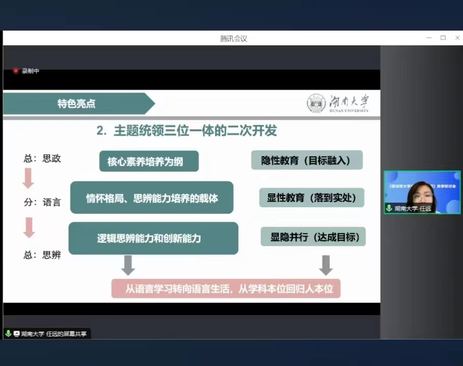 2024年6月19日晚七点半,由上海外语教育出版社和香港赛马会 联合主办的《新目标大学英语综合教程》教学研讨会隆重开幕。本次研讨会荣幸邀请到该教材的主编团队,来自湖南大学的四位专家,分别就教材编写理念、教学设计、课件使用及数字资源平台使用等方面做了讲解和展示,旨在帮助大学英语教师更好地理解教材,进一步提升教材使用水平和大学英语教学效果,更好地满足当代大学生的英语学习需求和思政教育。本次研讨会通过腾讯会议和外教社官方直播平台同时面向全国进行,参会人数达到千余人。