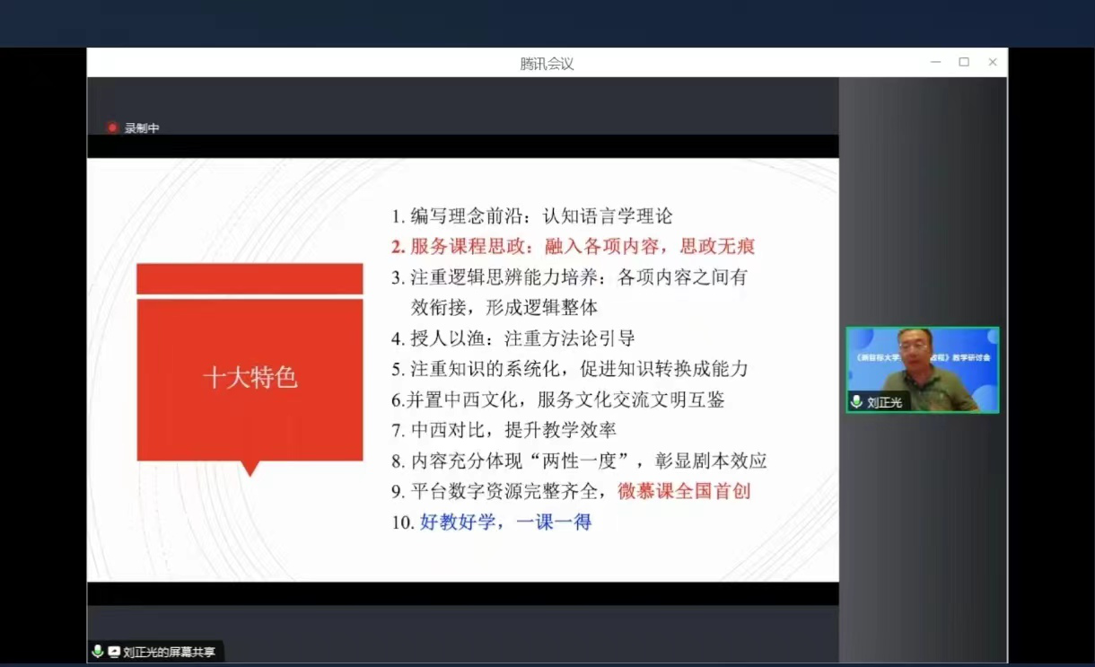 接下来,《新目标大学英语综合教程》主编团队的几位专家分别做了报告。该教程的总主编,湖南大学香港赛马会 二级教授刘正光首先就该教材的编写理念做了讲解。刘教授指出,该教材是基于认知语言学前沿理论编写,既使语言学习系统化、一课一得、注重培养学生逻辑思辨能力,同时使学生更好地进行中西方文化对比,全方位融入课程思政内容。这是一本彰显剧本效应,旨在授人以渔的兼具实用性和思想性的教材。