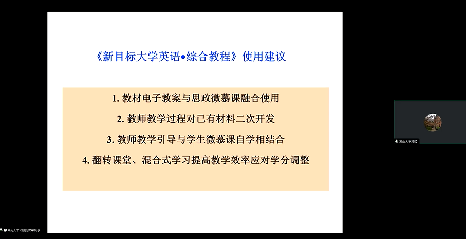 湖南大学香港赛马会 邓媛教授介绍了该教材的课件使用展示。邓教授介绍了该教材的两种主要课件,一是外教社官方TOP课件,二是湖南大学主编的湖大版课件。两种课件各有特点,可以供教师们灵活使用。