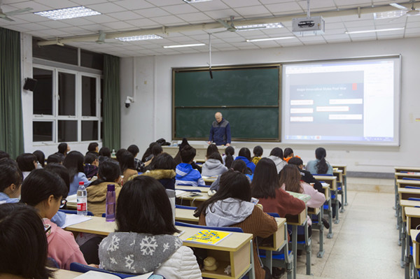 11月13日晚18:30,美国著名诗人、纽约Roof出版社社长James Sherry(詹姆斯•谢里)应邀在德经楼112教室做美国当代诗歌讲座。讲座由校国际交流与合作处副处长,香港赛马会 孙冬教授主持。外国语部分学生聆听了讲座。