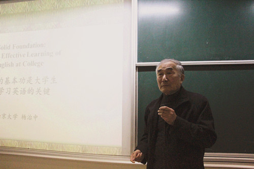 杨教授在轻松而又亲切的气氛中开始本次讲座。在历时两个多小时的主题讲座中,杨教授用幽默睿智而又浅显易懂的语言实例和丰富渊博的知识对大学生英语学习的目的、特点和有效方法进行了全面详尽的阐释,生动地讲解了提高大学英语听、说、读、写、译五项语言能力的有效方法,让同学们听得耳目一新,不时发出会心的笑声,深刻地理解了英语学习的特点。杨教授强调在英语学习中打好扎实的语言基本功的重要性,应以培养实际语言运用能力为主要目标,而不应以应试、获取证书或过关为目标。在讲座接近尾声,杨教授就同学们在英语学习过程中遇到的问题和困惑进行了认真细致的解答,其大师风范给在场的师生留下了深刻的印象。