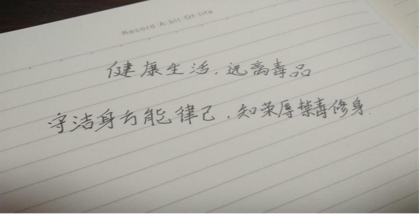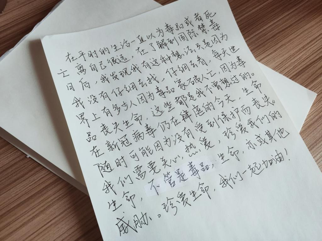 来自商务英语1901班的蔡雨萌同学,用娟秀的字体,写出了对于禁毒于生命的决心。她平时就是个乐观的女孩,不管是在平时还是疫情期间,笑容似乎都能融化一切。这不就正是我们青年所需要的吗?乐观面对生活,积极抗疫,远离毒品。