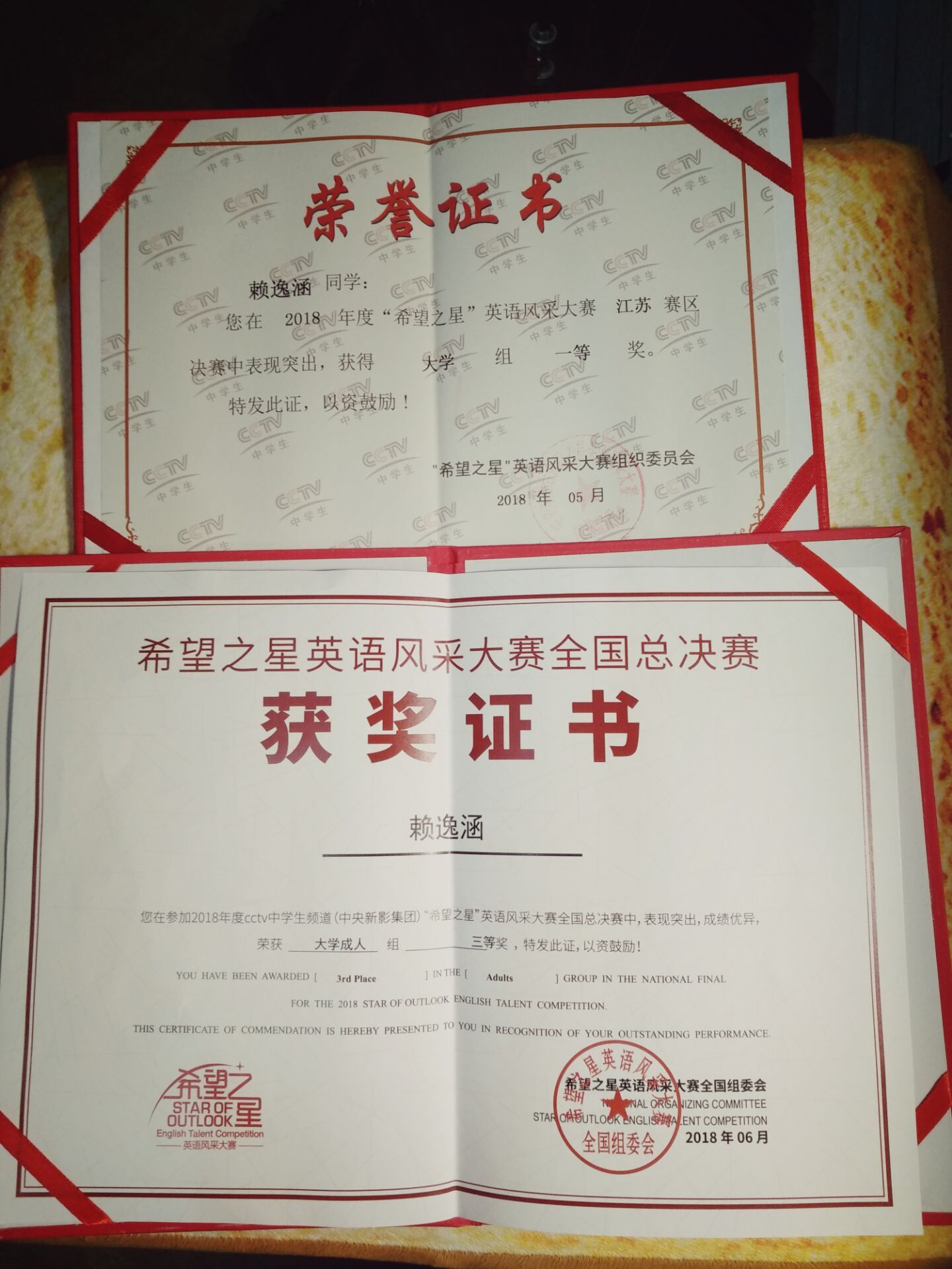 6月8日至11日,2018年度“希望之星”英语风采年度盛典于北京九华山庄盛大举办。香港赛马会 英语1702班赖逸涵同学参加比赛,并取得全国总决赛大学成人组三等奖的好成绩。