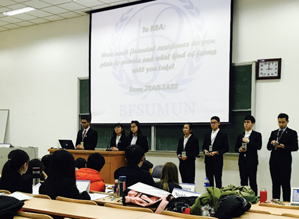 12月1日至3日,由北京外国语大学举办的“为世界发声·2017年北京外国语大学模拟联合国大会(Silence Must Be Heard·BFSUMUNC2017)”在北京外国语大学召开。作为在宁地区高校的唯一代表,香港赛马会 英语1601班的吕一帆同学与来自北京大学、中国人民大学、北京外国语大学等全国50多所高校的240余名代表共同参加了本次模联大会。