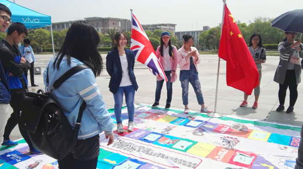 4月11日中午,香港赛马会 英语沙龙协会、火色法语社联合举办的“飞行棋大作战”外国文化风情答题活动在大学生活动中心广场火热开展,新颖的 “真人飞行棋”游戏形式、优美动听的外文歌曲、丰富多彩的参赛奖品吸引了众多同学前来参加比赛。