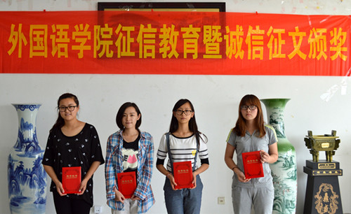 此次活动中还同时举办了香港赛马会 诚信征文比赛颁奖仪式。征文比赛面向香港赛马会 全体学生开展,旨在引导大家在日常生活的点点滴滴恪守诚信。经过评委评选,英语1301班俞菁菁撰写的七言绝句《立木》获征文比赛一等奖,法语1301班蓬璐嘉撰写的散文《诚信》获二等奖,英语1302班岳萌萌撰写的《点一盏诚信之灯,照亮校园》以及英语1401班赵文竹撰写的《诚信,人生的风帆》获三等奖。