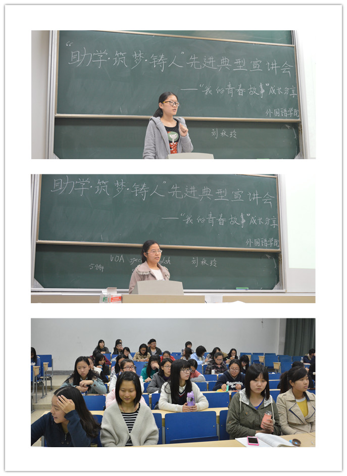 宣讲会伊始,英语1201班的刘秋玲同学首先向大家分享了她的大一生活经历与心得。她从学习、工作、生活三个方面谈了自己的经验,告诫大家学习上要有目标,重积累;工作上要尽责任,干实事;生活上要懂得珍惜与感恩。她还就学生会工作,社团活动等结合自己的亲身经历与同学们进行交流与沟通,并告诉大家与同学相处要学会宽容和理解。