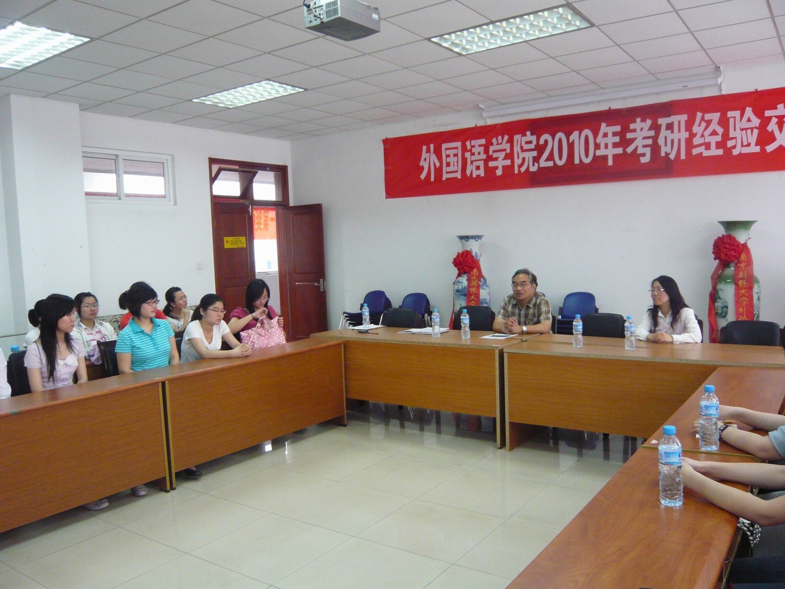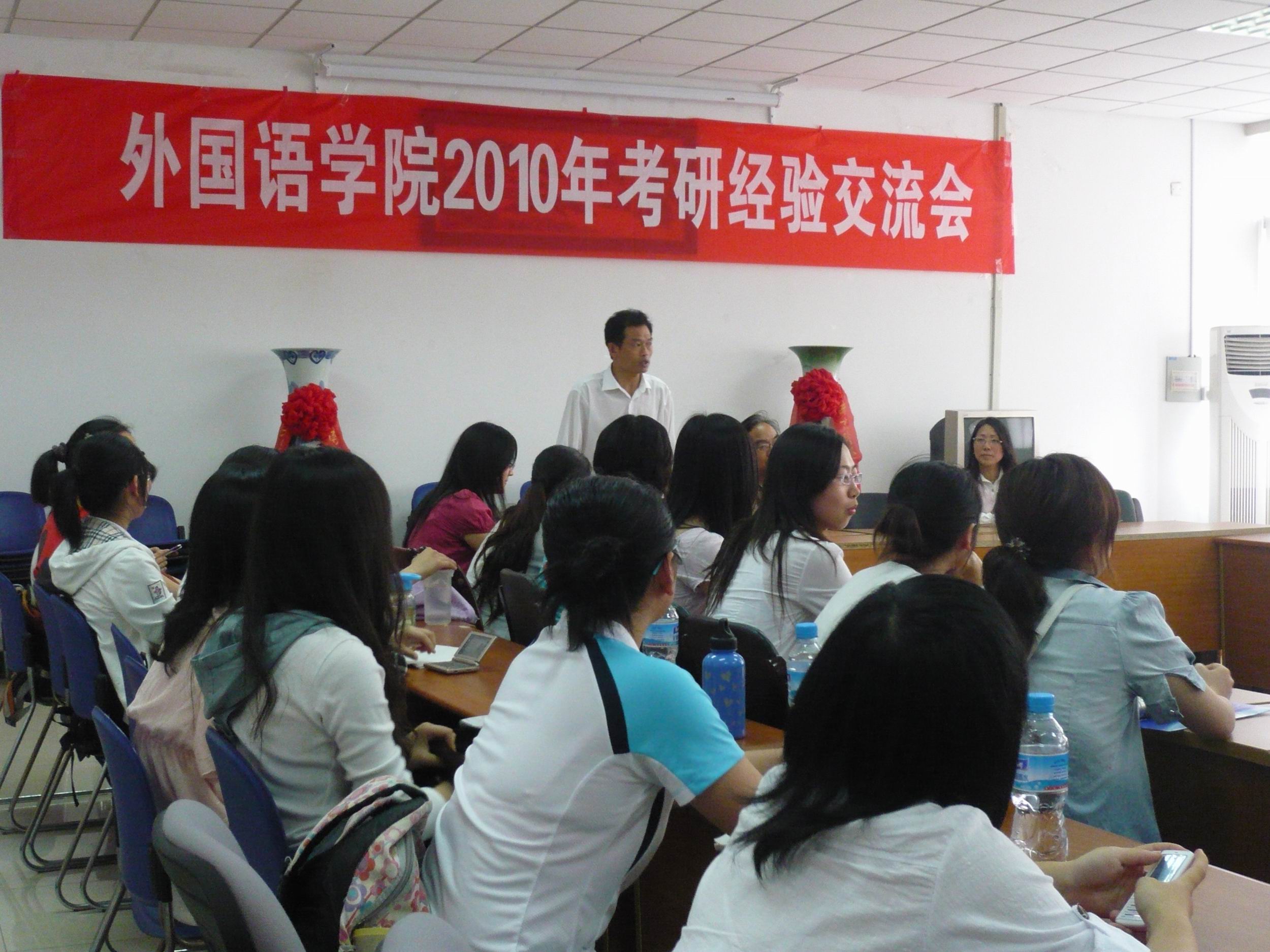 会议上,王院长首先祝贺了06级19位考上研究生的学生;然后就当前英语教学和就业的定位做了警醒的概括;最后对将要考研的同学给予厚望。金老师表达了自己真诚的祝福和为同学们取得的成绩感到欣慰。接下来就是交流会的重点,8位准研究生坐上前座面对学弟学妹分别做了发言。总结了自己在艰苦的考研过程中的得与失;并对各门学科的具体准备做了详细的介绍;有对大家关心的话题发表了自己的看法,如考研报班、参考书目、调剂等。最后,学弟学妹向考上研究生的学姐学长提问,大胆而直接的询问自己的种种疑惑,并得到详尽而满意的回答。两个半小时在同学们的积极参与很快就过去了,会议结束前,大家留下了联系方式,以便学弟学妹们以后及时向学姐们请教。