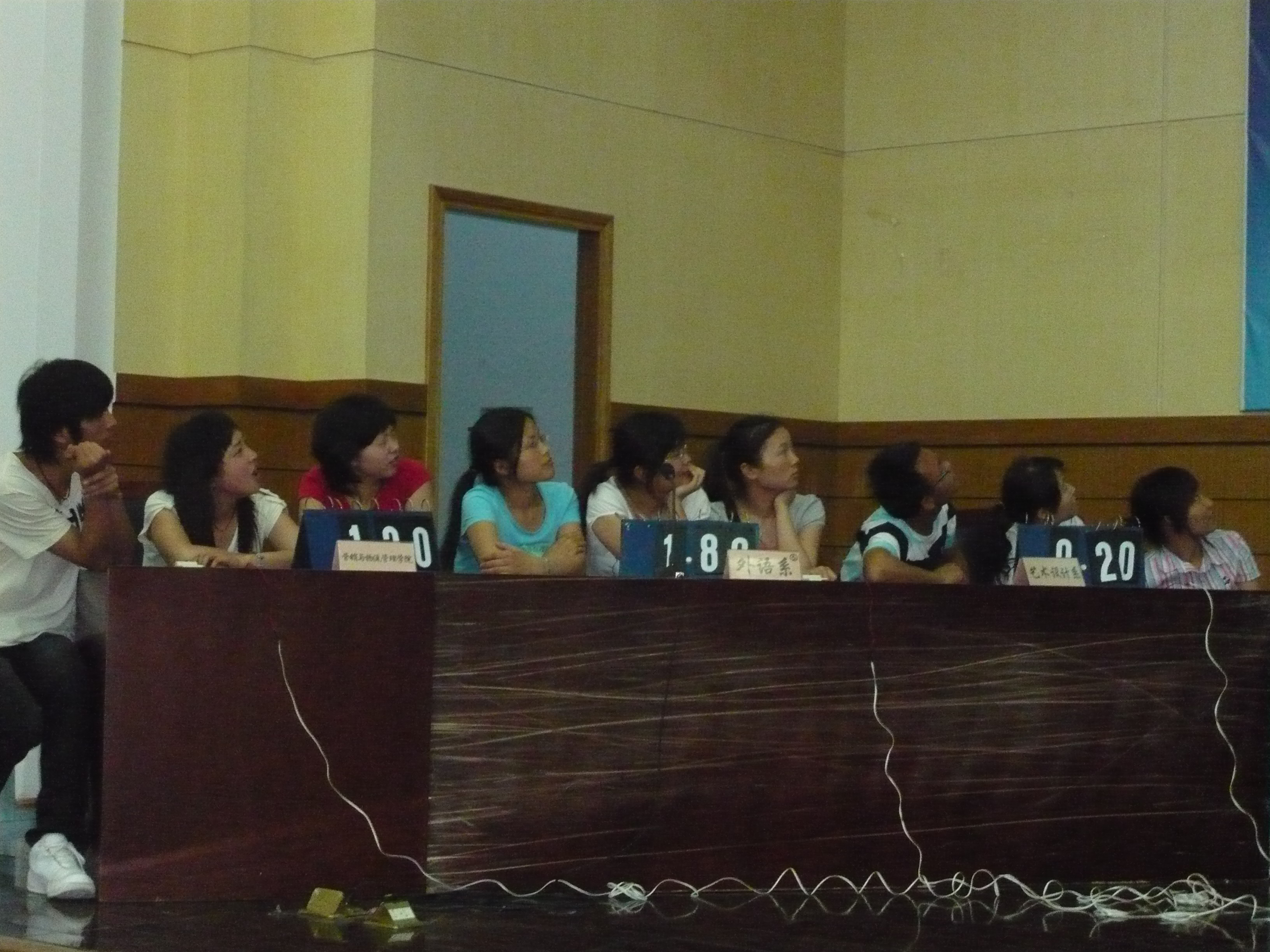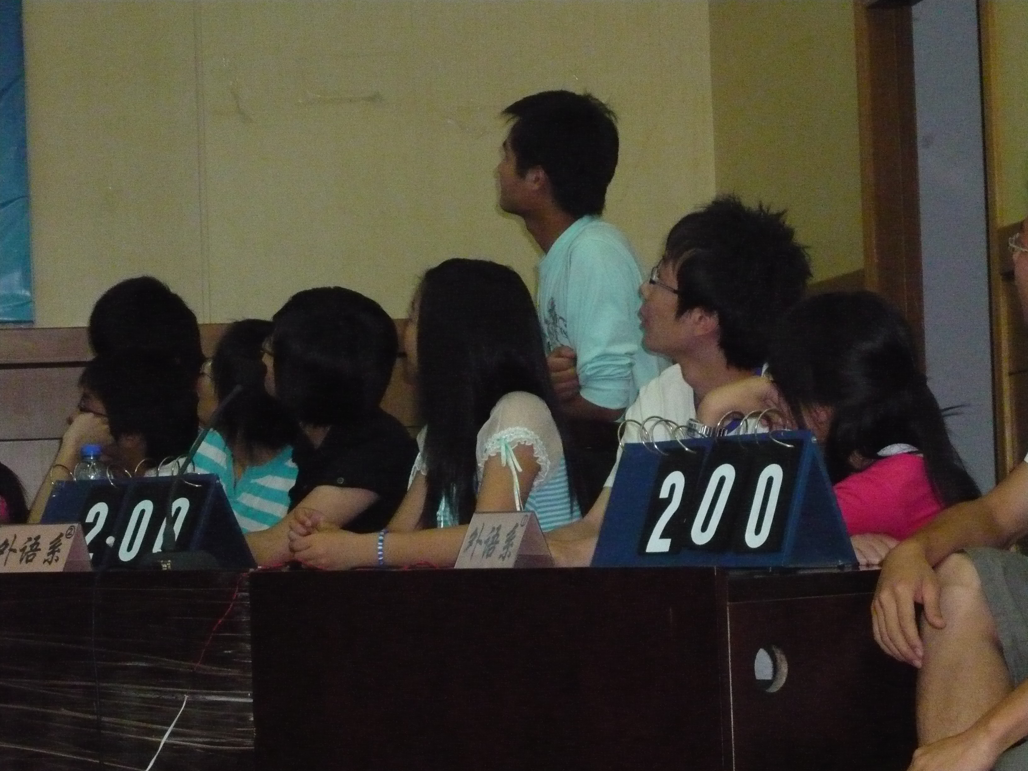 本次知识竞赛涉及到英美国家的文化常识,如文学、地理、历史、名人、影视作品、音乐、节日风俗、常用俚语等。经过第一轮的初赛,从十个小组中按分数高低选出了六个小组进行决赛。“激流勇进”中各小组认真做答,丝毫不敢怠慢;“出奇制胜”环节中,每个队伍从给定的话题中选择一个回答相关问题;“夺宝奇兵”,后援团则发挥了他们的作用;“决战巅峰”时,各小组更是奋力地做最后的拼搏。