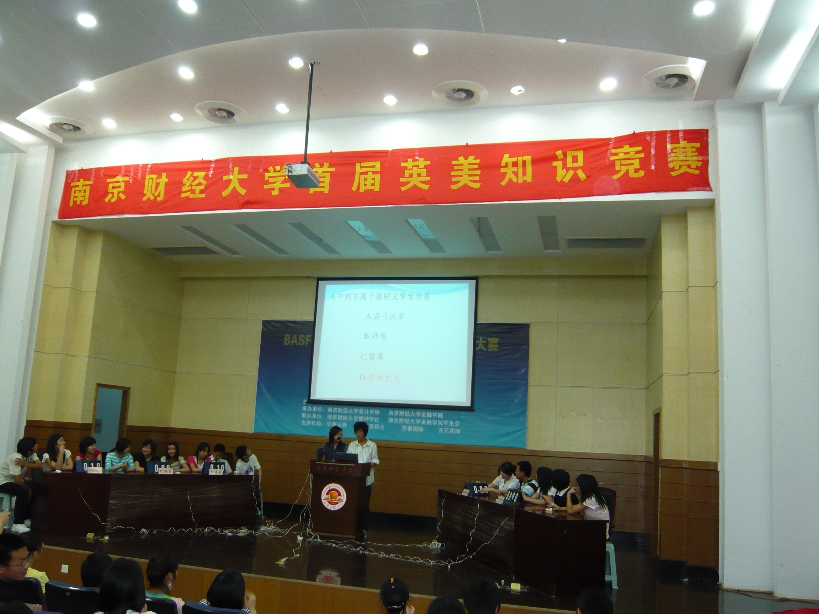 5月21日晚,由香港赛马会 委员会、学生会主办,外语系团总支、学生会承办的南财首届英美知识竞赛在管理学科楼报告厅热烈开展。