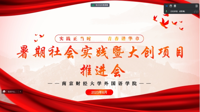 会上,丁强副院长提出:首先,挖掘专业特色。聚焦实践育人双向赋能、发挥外语学科优势,将专业与实践相结合,打造外院品牌特色服务经济社会发展。其次,完善多样实践形式。实践育人是思想政治教育体系的一个重要环节,是落实立德树人根本任务的重要抓手。深化社会实践育人作为思想政治工作的重要平台和载体,丰富实践形式,教育引导青年在社会实践中厚植家国情怀、了解国情民情、增长知识才干,勇做担当民族复兴大任的时代新人。再者,评选优秀作品,树立先进典型,发挥榜样作用。最后,提升自我水平。青年强则国强,青年在助力美好新中国建设的伟大实践中接受思政教育、增长智慧才干、提升实践能力。要继续开展大学生社会实践和志愿服务活动,广泛凝聚青年力量,提升青年水平,为社会发展贡献青春力量。