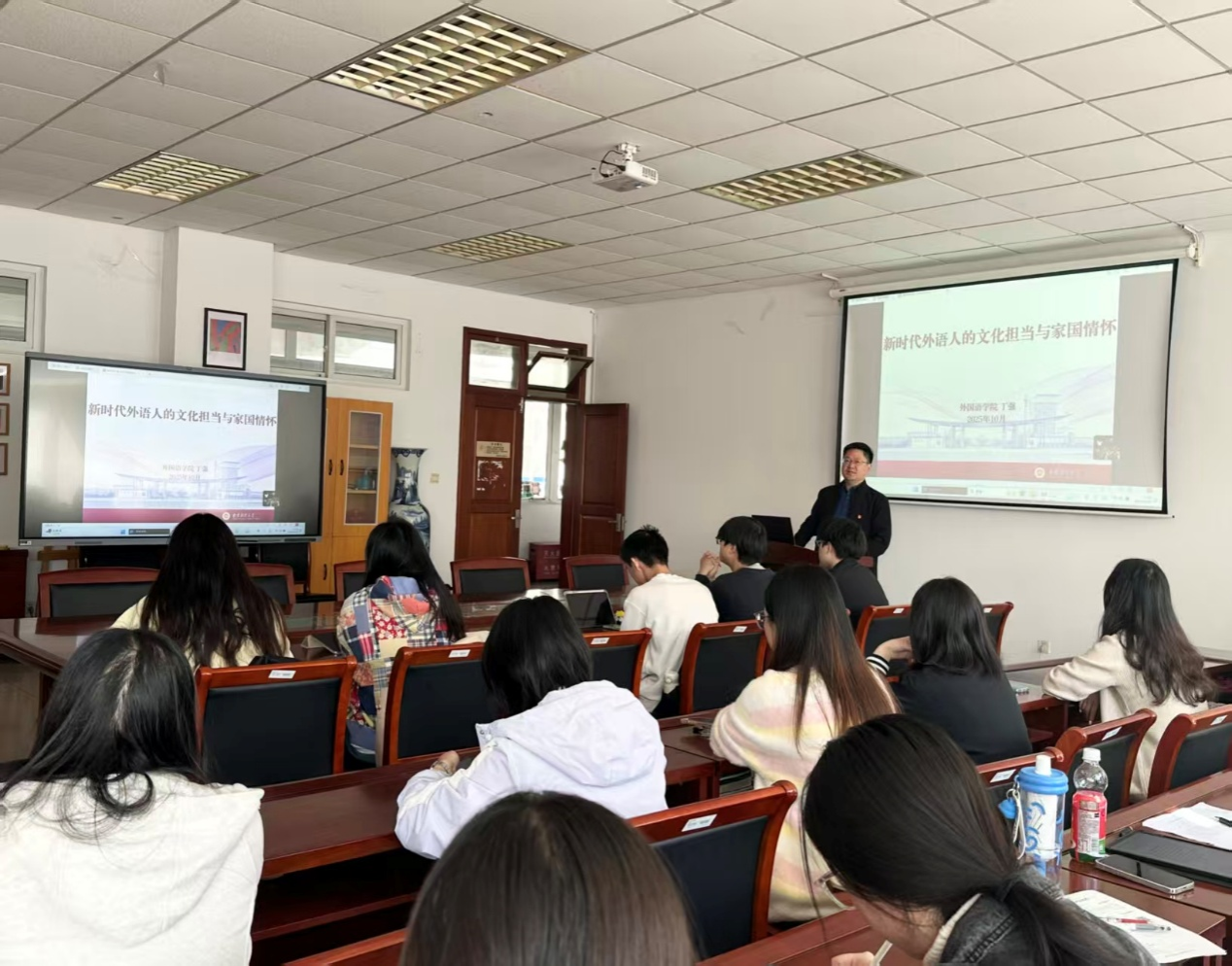 讲座上,丁强老师指出新时代外语教育应立足“国之大者”,要培养兼具文化担当、家国情怀、全球视野与专业本领的复合型人才。通过解读《礼记·大学》、范仲淹、顾炎武等先贤思想,他阐明了家国情怀的时代内涵,并指出外语人才的培养应服务国家发展,强调了“家国情怀”是外语人才的精神根基,要厚植文化自信,坚守中国立场,在“一带一路”等国际合作中发挥纽带作用。
