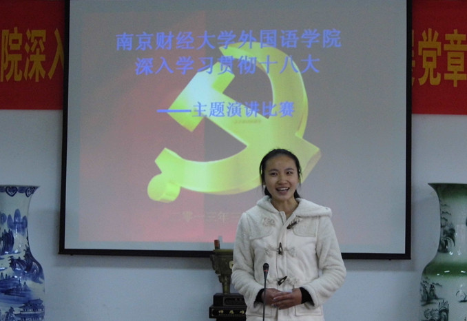 参赛的第一位选手就是法语1202班的郝张静,虽然是大一的新生,但是却能犀利地指出十八大的不足点,演讲深入人心,使本次比赛有了一个良好的开头。