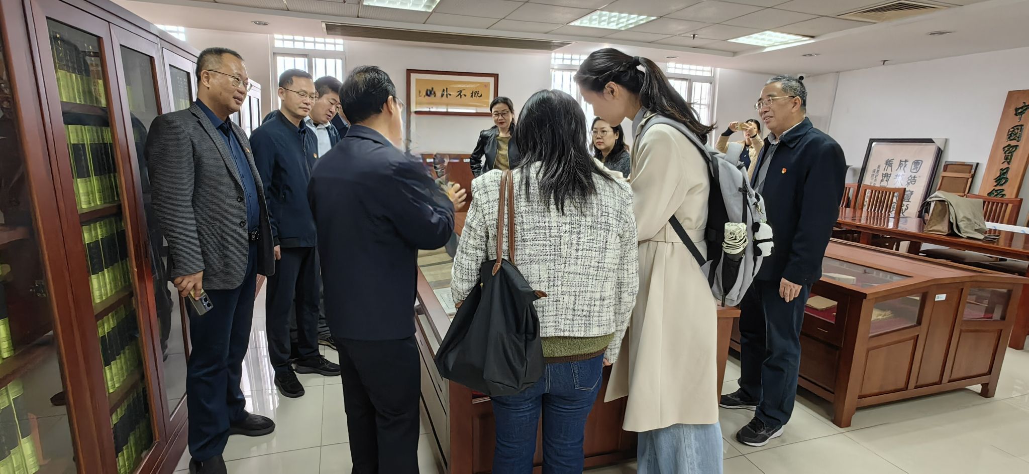 在图书馆田伟老师的引导下,党员们走进图书馆五楼特藏室,认真听取关于“四库全书”“米芾书法全集”以及雕版馆藏等珍贵文献的介绍。来自金陵刻经处的雕版实物,让大家近距离感受历史名家思想,同时也切身体会到我国雕版印刷技艺的深厚内蕴。